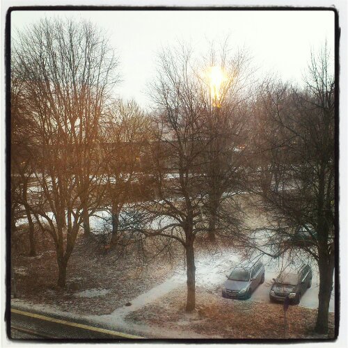 Jag har i alla fall kommit igång och börjat få hyfsat bra rutin på min träning 🙂 Har hittat fyra- fem olika pass på gymmet och jag försöker hinna med åtminstone två eller tre av dom per vecka. Jag har också börjat tycka om något som jag aldrig trodde att jag skulle göra!!! Nämligen löpning! Har ju gjort mina försök ibland men inte fastnat för det nått speciellt. Men nu… Jag kan nästan längta tills jag ska ut och springa. Märklig känsla 🙂 Idag såg det t.ex. ut så här utanför fönstret…