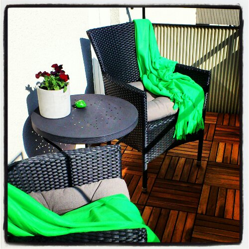 Golvet under trallen såg inte heller så kul ut… Men mina föräldrar hade varit på ÖB åt mig och köpt nya, fräscha trall som vi, pappa och jag, la på plats. Lite pussel bitvis blev det men vi fick dit det. När golvet låg där det skulle blev det en vända till Jysk för inhandling av två fåtöljer. Jag ville inte ha nått vanligt litet café’set som folk brukar ha på sina balkonger, utan riktiga stolar så det känns lite möblerat. Hittade precis vad jag ville ha. Det blev även ett par filtar och nya blomkrukor med penséer. Bord behövder jag inte köpa nått för hyresgästerna som bodde här innan hade lämnat två små bord som jag bara behövde tvätta av så blev de jättefina. Känner mig faktiskt riktigt nöjd med min balkong 🙂