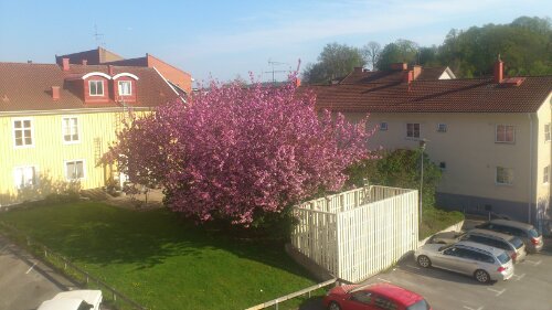 Och ett underbart vackert träd som blommar för fullt i rosa blommor på andra hållet.. Vet tyvärr inte vad det är för sort. Ni kanske vet!!? Står förresten två till likadana fast mindre lite längre bort också. Så vackert. 🙂