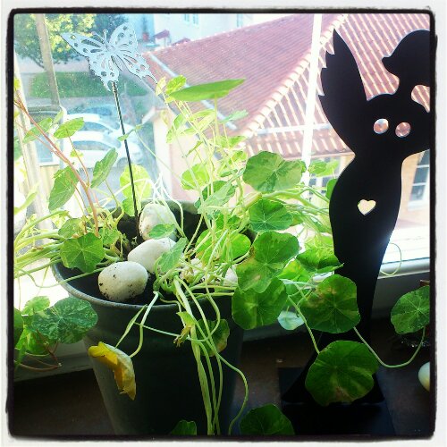 En helt slät, lite högre zinkkruka med någon form av murgröna i, plus vita stenar och en fjäril i zinkfärgad metall. Passar perfekt i mitt fönster tillsammans med mitt zinkhus och min Ängel från Susanne Demåne. Blev sååå nöjd. 🙂