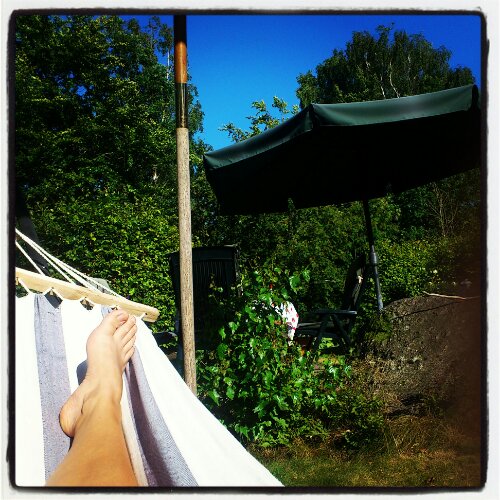 Så nu, efter allt ståhej, packade jag väskan och körde ner till mina föräldrar på landet och för att koppla av. Trodde jag skulle få ha Lillstugan när jag kom dit, men ack vad jag bedrog mig. Den hade min Systerson med flickvän lagt beslag på. Snopet! Men det fanns rum för mig ändå, inne i gästrummet i Stora Stugan. Går lika bra det. Men istället för en ”riktig” säng får jag sova i bäddsoffan. Inte lika bekvämt men det funkar det också. Fast hängmattan la jag beslag på en dag i alla fall. 😉