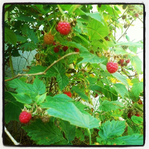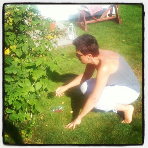 Plockar ”vilda” hallon till frukostfilen. De växer precis vid husknuten och på tomten.
