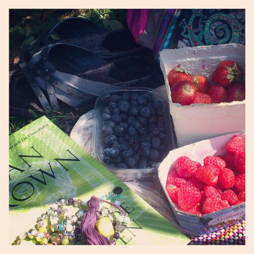 Annat som inträffar när man befinner sig i parken är att det nästan alltid dyker upp brudpar som ska fotograferas. Denna veckan har jag nog sett tre par. Själv har jag legat och lapat sol, läst lite och mumsat både jordgubbar, hallon och blåbär som ”lunch”. Sååå gott!