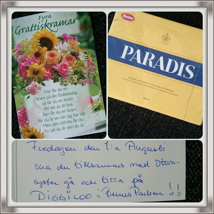 Av SysterYster med familj fick jag en chokladkartong och en kort. I det kortet stod det att jag ska fĂ„ gĂ„ pĂ„ Diggiloo ihop med min Syster i augusti! Tjohoo! Ska bli sÄÄÄ roligt! LĂ€ngtar redan…