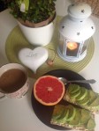 Det är nog det bästa med att ha ledig dag från jobbet… Go’frukostarna! Jag som i vanliga fall definitivt inte är någon frukostmänniska. En kopp kaffe och en alvedon brukar vara standard. Alvedonen för att jag väldigt ofta vaknar med huvudvärk. Glädjande nog har det blivit bättre på sistone, vad nu det kan bero på. Men det brukar gå lite upp och ner med det. Nog om det… go’frukostar var det. Att få sova till det så länge man vill och sedan plocka fram lite smarriga saker att äta till frukost. Som idag blev det kaffe med mjölk (såklart), surdegsknäcke med skivad avocado och örtsalt (med chili) och blodgrapefrukt. Sedan tända lite ljus och njuta av tystnaden. Sonen är hos sin Flickvän och Pojkvännen jobbar så bara att njuta med andra ord. Även om jag njuter när jag har mina nära och kära hos mig också. Men det är ett annat sätt av njutning, med stoj och stim och prat ocha skratt. Underbart på sitt sätt! Men jag njuter nästan ännu mer av lugnet och tystnaden.