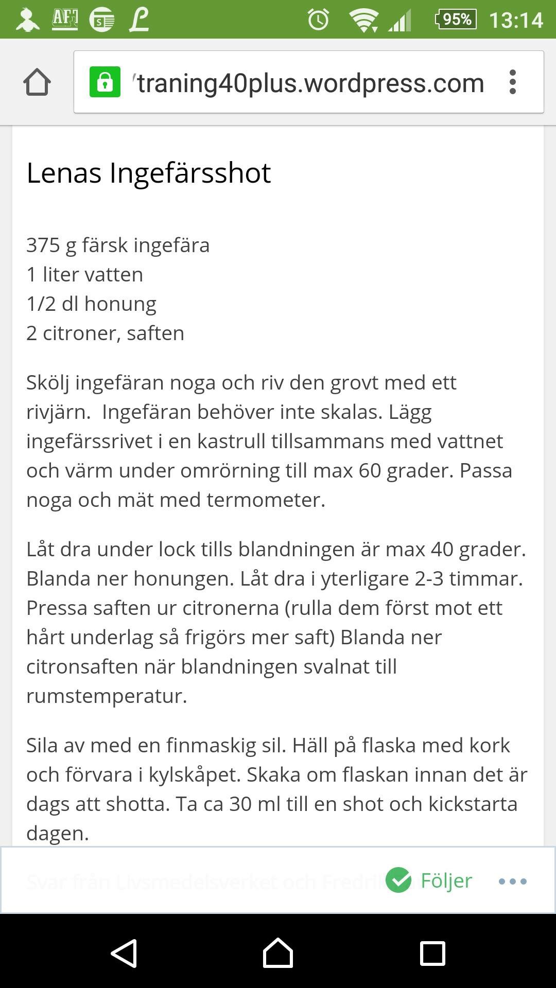 Har aldrig provat denna ädla dryck så det ska bli väldigt spännande. Ingefära tillhör ju kategori ”superfoods” och ska tydligen vara bra mot/för lite av varje som immunförsvaret, matsmältningen, ömma leder mm mm. Mina förväntningar är höga.😉 Hittade receptet på en blogg som heter ”Träning 40plus”. Tycker att det verkar vara en bra blogg med både kostråd och träningstips. Men även lite tester av olika produkter som t.ex. träningskläder. En blogg jag helt klart kommer att följa och återkomma till.