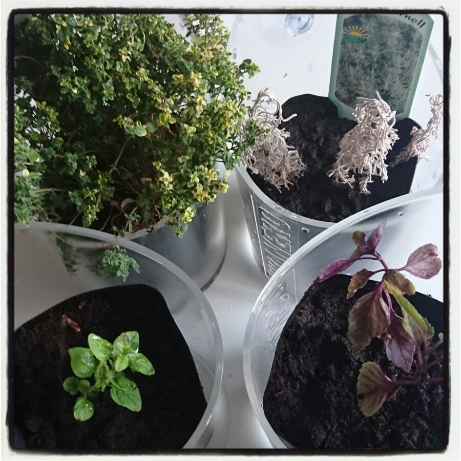 Förutom att ha tagit hand om lite fröer så har jag höststädat lite på balkongen. Slängt ut lite vissna växter och diskat av dom tomma krukorna, planterat om och dammsugit. Bland annat fick några kryddväxter bli omplanterade och inflyttade till köksfönstret istället.