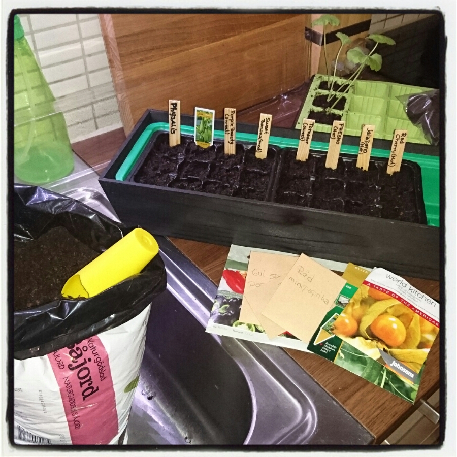 Det som har såtts hitintills är physalis, snackgurka, fyra olika paprikor, sex sorters chili och kronärtskocka. Och det börjar som sagts redan spira bland fröna och det är inte ens två veckor sedan jag sådde.