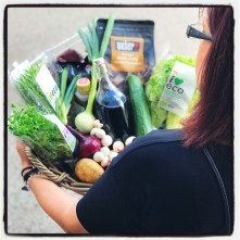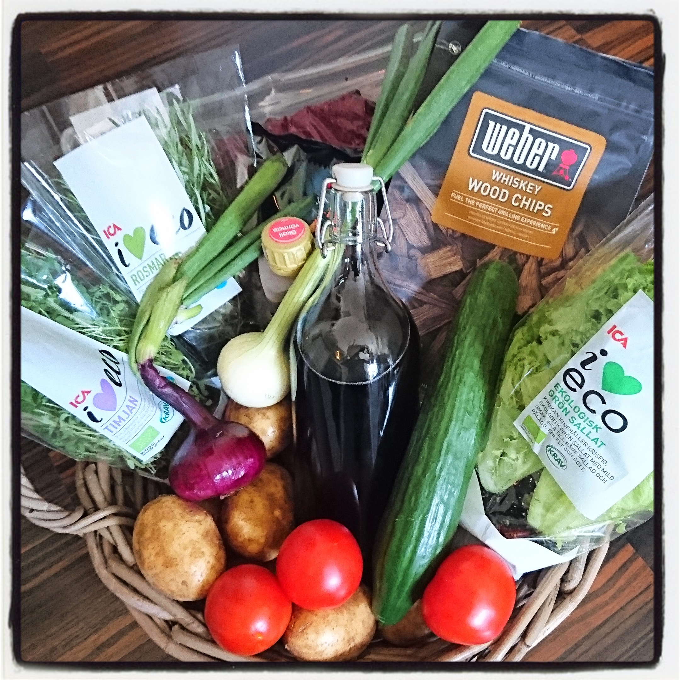 Korgen fick innehålla pepparbiff, potatis, vinsås, lök, tomat, sallad, timjan, rosmarin och en flaska rött vin. Och eftersom jag inte hunnit gå och köpa en vanlig flaska vin så tog jag en flaska med snäpplock som jag hade hemma och fyllde på från min bag-in-box ‘tre apor’. Blev lite roligt tycker jag.