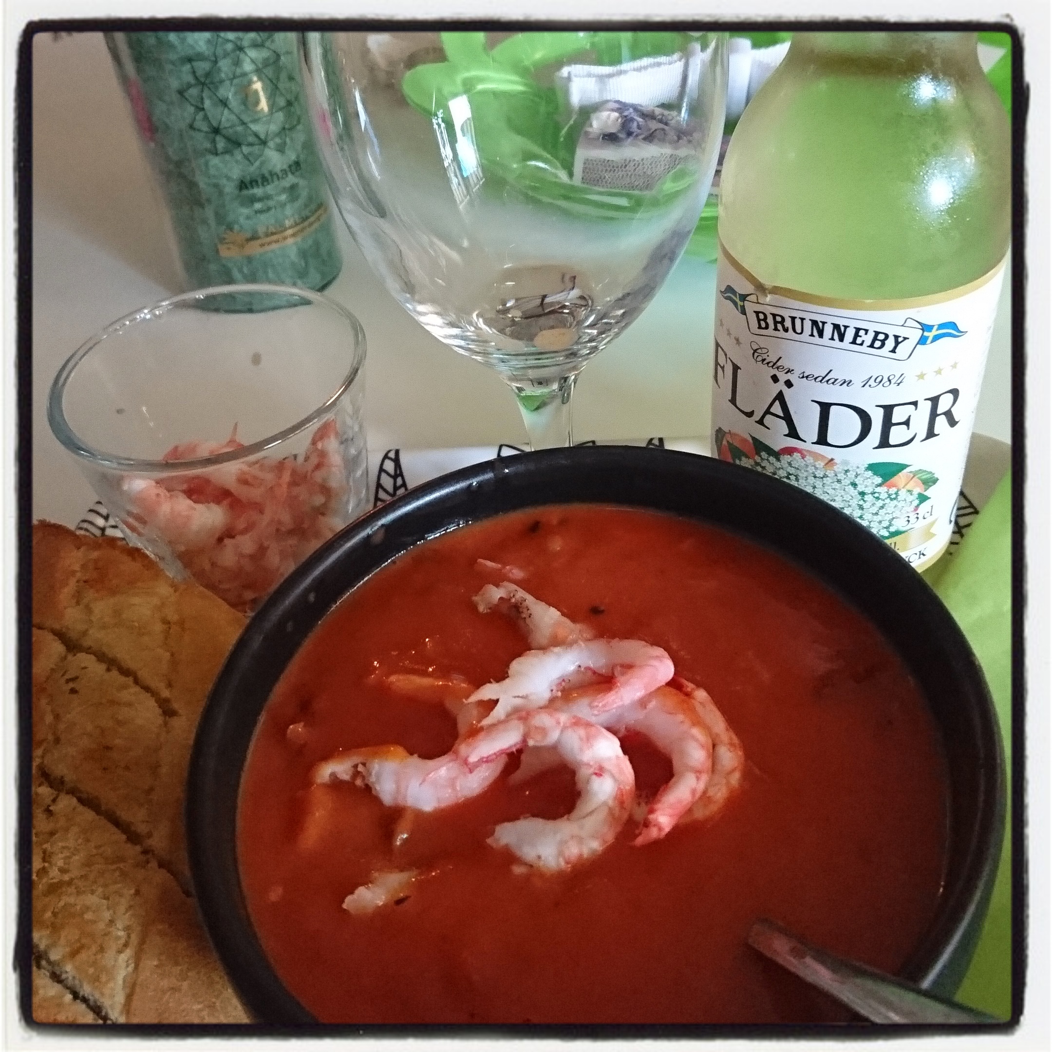 Efter att ha varit med Dottern och handlat och kört henne hem till grannstaden så sitter jag nu i lugn och ro hemma i soffan och kollar en stund på ‘Morden i Midsummer’. Vännen är hemma hos sig, han börjar jobba imorgon. Och Sonen är hos flickvännen. Nyss intog jag en liten ‘lyxmiddag’ bestående av tomatsoppa, räkor, vitlöksbröd och flädercider. Kryddade upp soppan lite extra med vitlök, vitpeppar och lite chiliflakes. Blev förvånansvärt gott.
