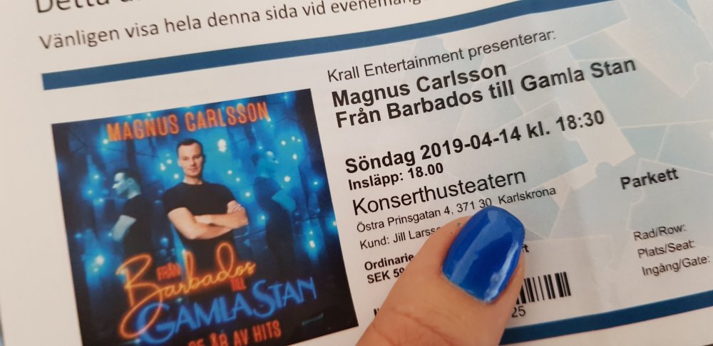 Har totalt glömt bort att blogga om konserten jag var på innan påsk. Närmare bestämt den 14 April. Det var en födelsedagspresent till mig själv kan man säga. Jag fyllde den 11 April så det var ju lite lägligt att den var nu även om det är var ett par månader sedan jag köpte biljetten. Ja biljetten, jag gick själv. Och vilken konsert var det nu då… Konsert o konsert mer show var det faktiskt. Jo, det var ‘Från Barbados till Gamla Stan’ med Magnus Carlsson.