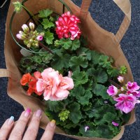 När jag ändå var där så blev det ett par (läs fyra) pelargoner som fick följa med hem också. Samt att jag fick ett träd på köpet mot att jag skulle försöka få liv i det igen. Och det såg sannerligen ledset ut. Men jag tänker att en ny kruka, ny jord och lite näring så ska det nog gå att rädda. Ska bara googla lite på hur det ska skötas först.