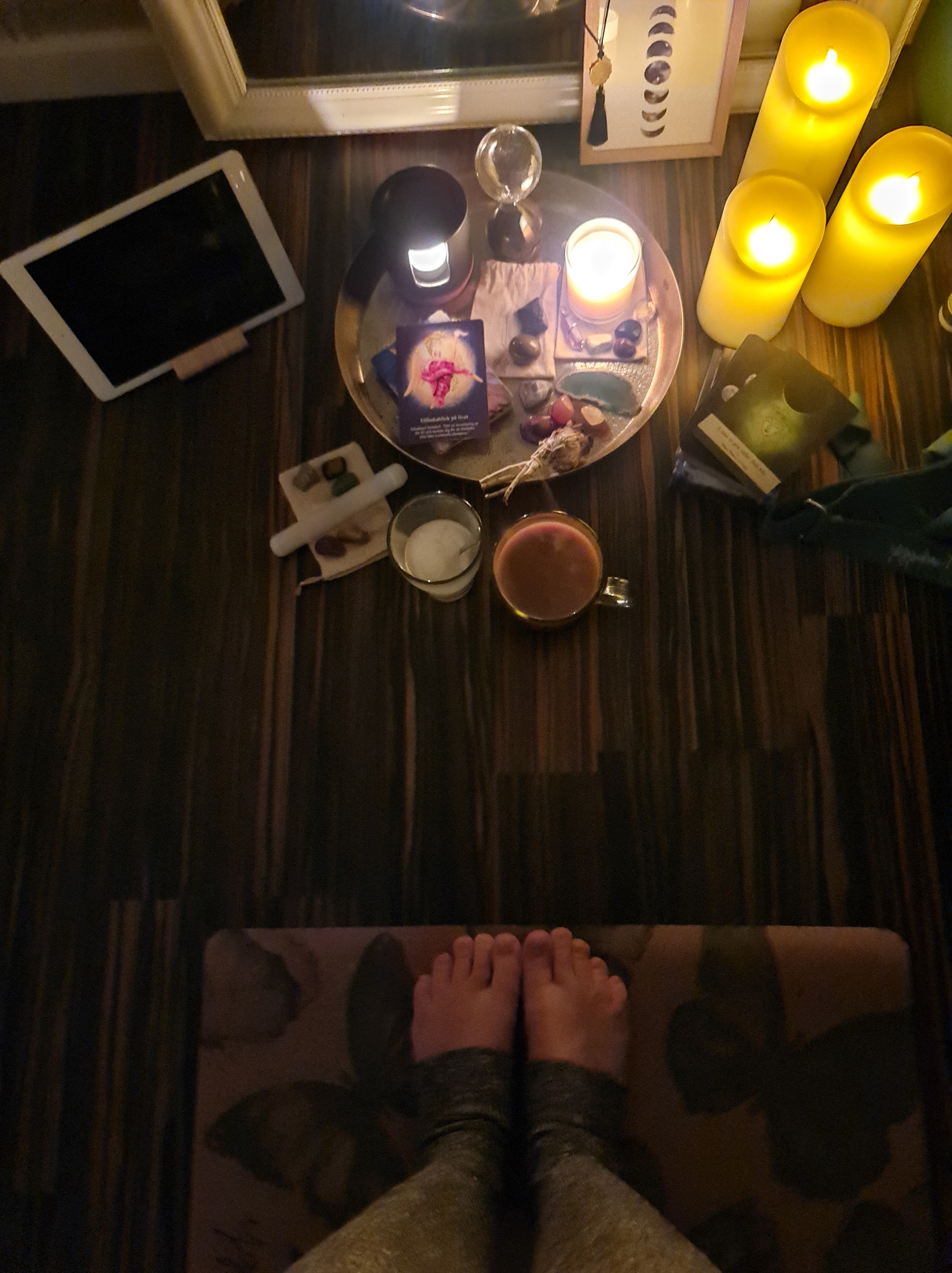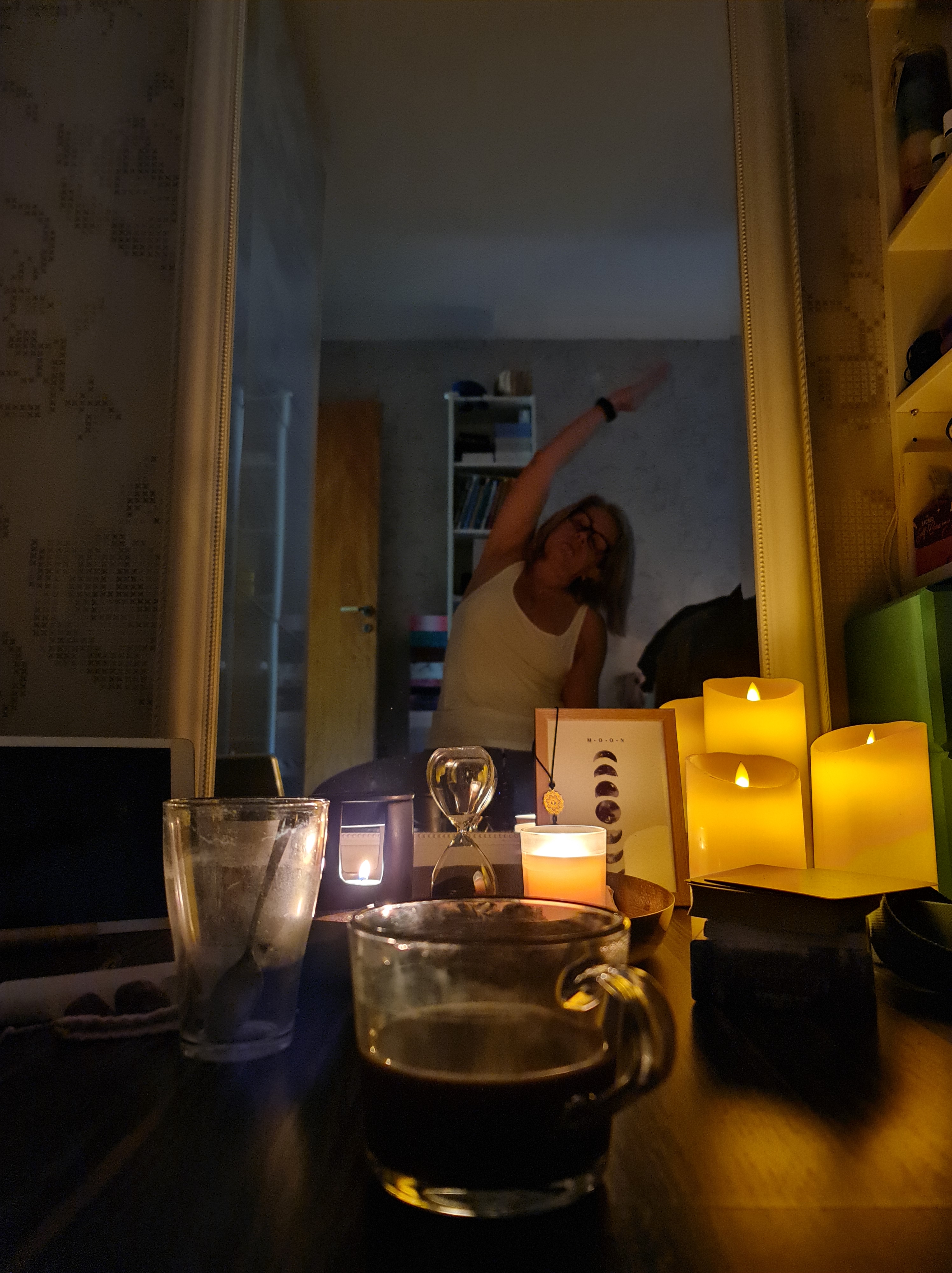 Så istället för att, som jag gjorde innan, stiga upp en knapp timme innan jag börjar jobba (efter mycket snoozande) och stressa med att fixa mig, fara iväg och komma in med andan i halsen på jobbet så mjukstartar jag nu istället. Klockan ringer numera mellan två och tre timmar innan jag börjar (oftast någon gång mellan kl.5 och 6). Då stiger jag upp och börjar med att tända massor av ljus i sovrummet. Där efter sätter jag på kaffet och går på toaletten. Lagom till jag är klar på toa är kaffet också klart. Då tar jag en kopp och går in till yogamattan i sovrummet och gör min morgonyoga. Under tiden dricker jag mitt kaffe i lugn och ro mellan övningarna. Därefter sätter jag mig och skriver i min Morgondagbok. Inga som helst krav att jag måste skriva i den varje dag utan känner jag att jag inte hinner så låter jag det vara. Fast det har hitintills blivit i stort sett varje dag för jag har känt behov av att skriva av mig lite på morgnarna. Varje kväll innan jag släcker lampan har jag även skrivit Tacksamhetsdagbok som en avrundning på dagen.