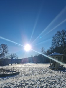 I lördags sken även solen från klarblå himmel och det var helt ljuvligt ute. Lite snö, kallt med klar och hög luft. Som gjort för en promenad i vår vackra park. Så sagt och gjort en promenad fick det bli. Fast det var faktiskt med viss möda jag lyckades hålla mig på benen vissa sträckor. Det var bitvis ganska halt på gångvägarna. Men jag lyckades även om det var något jobbigare än om det hade varit normalt underlag.