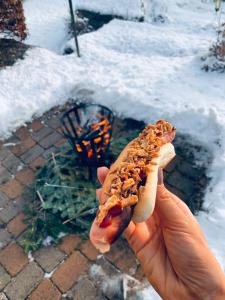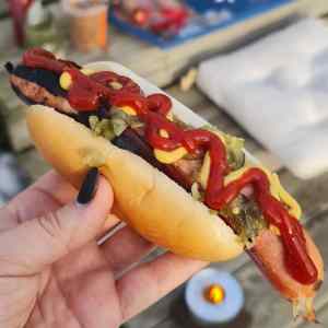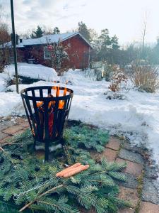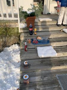När vi kom tillbaka från vår promenad möttes vi av en tänd brasa i vedkorgen. Och att mina Föräldrar hade dukat upp på trappan och förberett för grillning. Sååå mysigt och sååå gott att äta utomhus med solen som kikade fram mellan molnen. Ljuvligt!