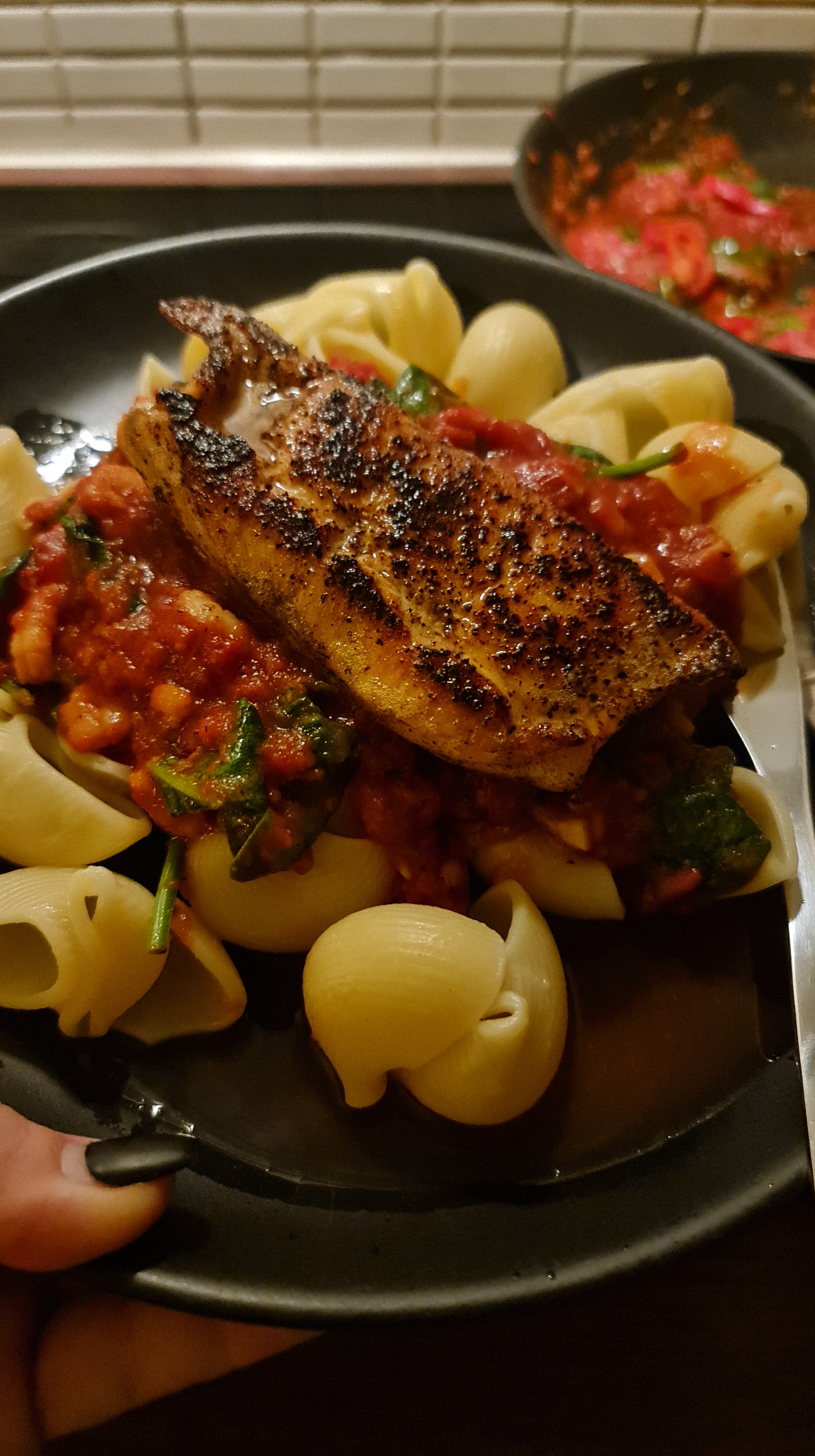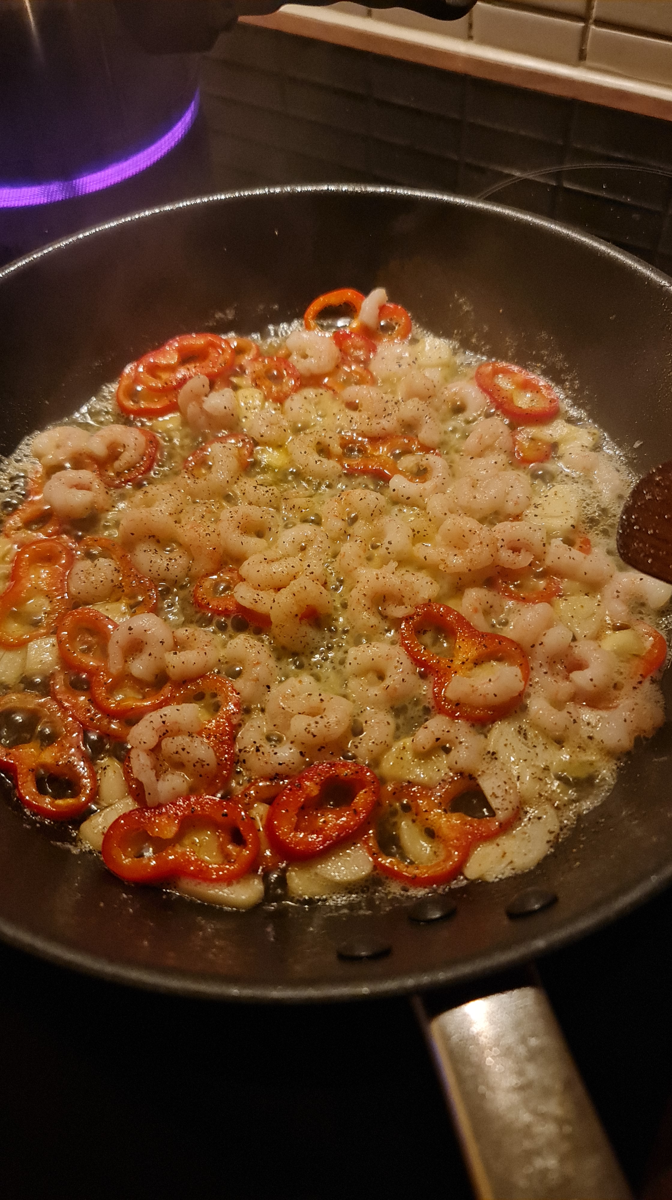 Väl hemma igen så var jag på väg att bli ganska hungrig. Tog fram räkor och lax ur frysen och gick sen och duschade. Ofta när jag ska fixa mat till mig på helgen vet jag inte vad jag vill äta.så det blir mycket ‘jag tager vad jag haver’ och improviserar lite. Idag fick det, som jag skrev, bli lax och räkor. Till det kokte jag pasta och en tomatsås.
