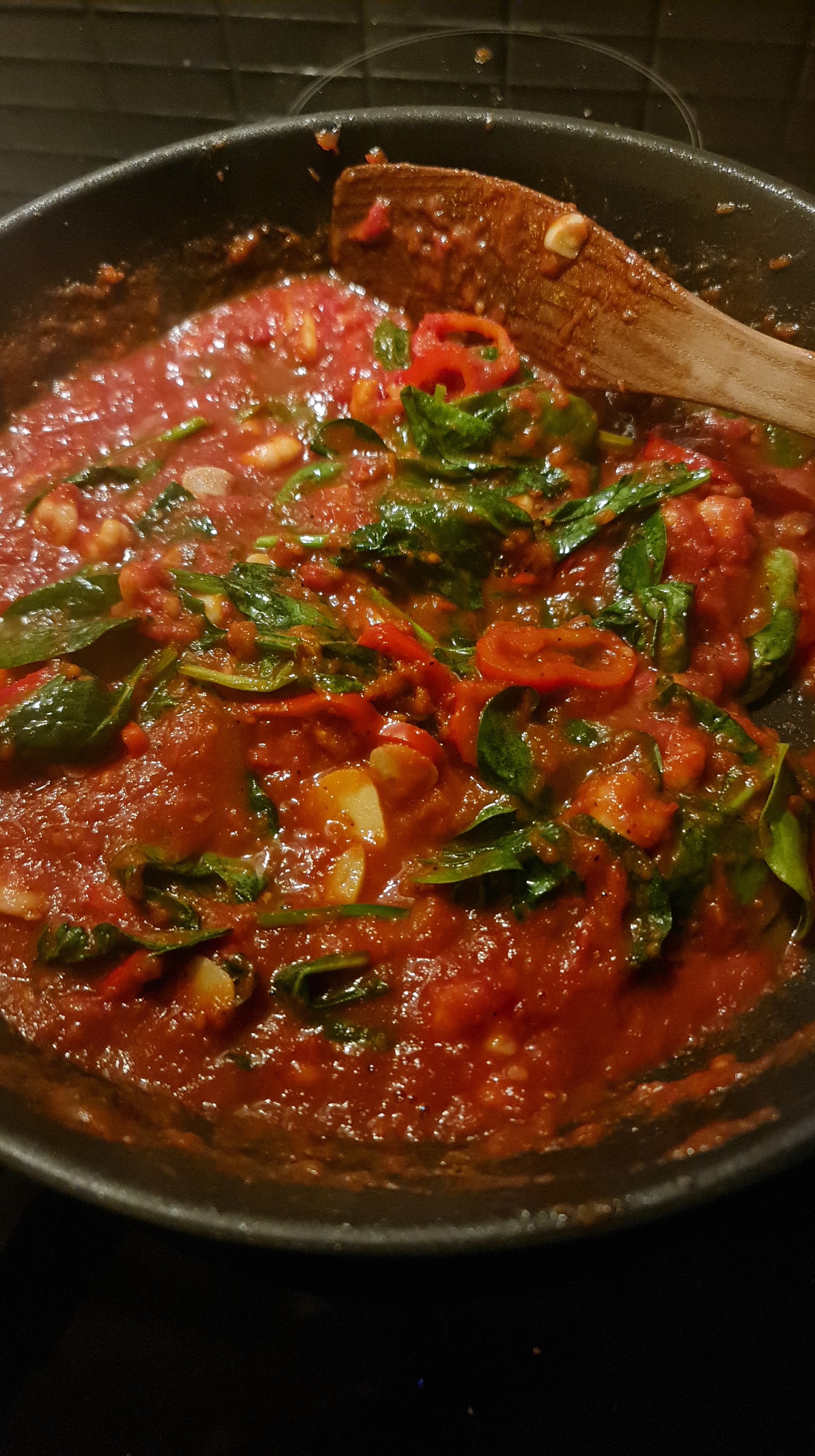 Stekte laxen först. Sen fräste jag räkorna och spetspaprika i smör och vitlök. På med tomatkross, bladspenat och citronpeppar och lite soja. Klart. Och det blev över förväntan gott. Och till efterrätt blev det choklad och melodifestivalen.