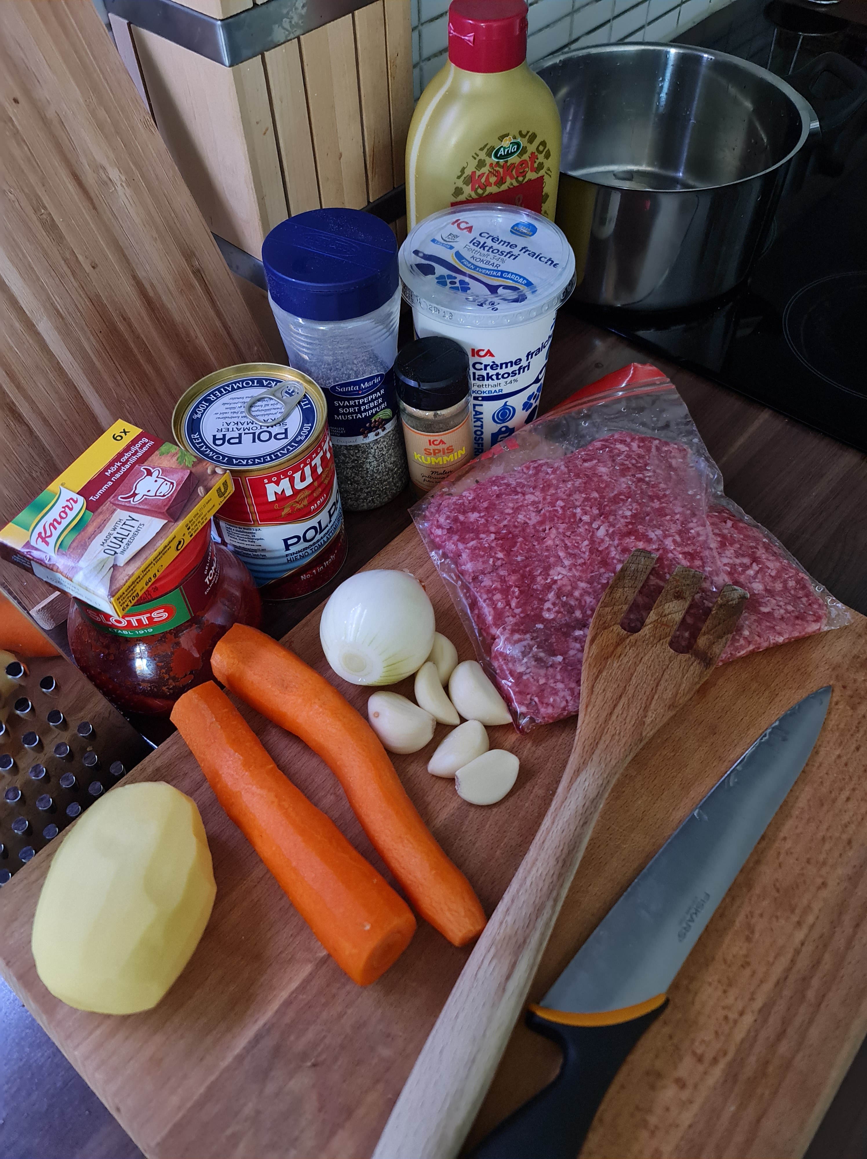 Idag blev det köttfärssoppa med spiskummin, chili och en stor klick creme fraiche uppe på och vitlöksbröd till det. Så mumsigt. Samtidigt tittade jag på ‘Tillsammans med Strömstedts’ när de hälsade på hos Lotta Engberg och Doktor Mikael. Så bra program och hur härliga var inte dom två ihop då!? Till efterrätt blev det en Nutellasemla och Mello. Så synd att inte Emil Assergård gick vidare. Jag gillar verkligen honom och hans musik.
