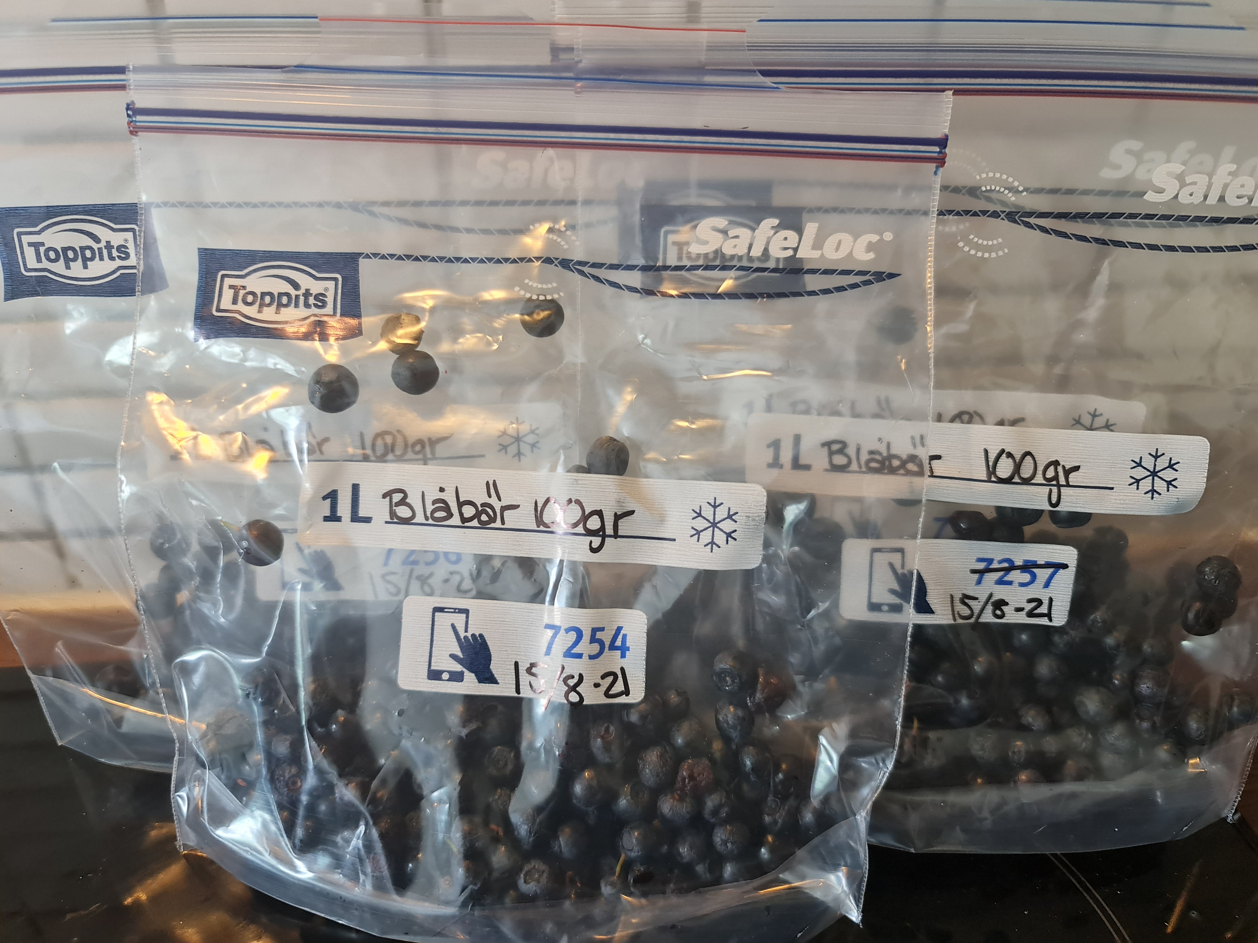 Detta gjordes hos mina Föräldrar, där jag har mitt så kallade Smultronställe. Så när jag ändå var där och kalaset var över passade jag på att plocka lite blåbär. Det växer på tomten och i skogen precis utanför. Blev inga mängder eftersom många av bären tyvärr var både små och lite torra. Men fyra påsar med 100 gram i varje blev det i alla fall. Alltid något.