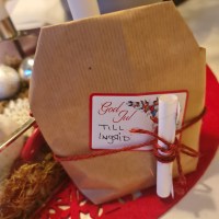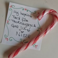 Så sagt och gjort. Jag plockade ihop en polkgriskäpp, två pepparkakor och lite Non-stops och lade sedan allt i en egentillverkad påse. Klistrade på en etikett och hängde på ett litet brev.