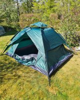 I helgen hittade jag i alla fall på lite jag vill berätta om. Det var äntligen dags att prova att sätta upp mitt nyligen inköpta tält. Jaaa, jag har investerat i ett tält. Allra helst hade jag velat ha en ombyggd van eller en liten husbil men det tillåter inte riktigt min ekonomi. Så då fick det bli ett tält. Och enligt instruktionerna skulle det ta tre sekunder att sätta upp detta tältet. Hmmm… Lite fundersam var jag allt, men bestämde mig ändå för att skicka efter det. Och baske mig… Okej, det tog inte tre sekunder kanske, men absolut inte över fem minuter. Så smidigt. Och att plocka ner det tog inte många minuter längre. Såå bra! Jag blev så glad. Min oro var, förutom uppfällningsdelen, lite att jag kanske inte skulle nå upp för att kunna fälla ihop det eftersom jag är ju inte så hög över havet. Typ lite drygt 160 cm. Men det gick alldeles utmärkt.