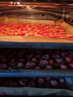 När jag höll på med sylt och saft kom jag på att jag ville prova att torka några jordgubbar. Så jag kan ha det i min hemmagjorda müsli i höst. Men jag har aldrig provat att torka bär förut men någon gång ska ju vara den första. Så jag skivade upp så det blev tre plåtar med jordgubbar och sen in i ugnen på 50⁰ i 12-13 timmar… Ja, det är länge. Och längre än så blev det också. Skulle dom tas ut vid rätt tid hade jag behövt vara uppe till kl.3 på natten. Glöm det. Dom fick gå tills idag på morgonen istället. Hur det blev? Nja…