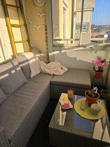 Men jag har faktiskt hunnit med lite annat också. Som jag nämnde tidigare, att jag har fyllt år och till mig själv köpt jag nya möbler till balkongen. Äntligen! Har letat i ett par tre år nu och äntligen hittade jag något jag kände var rätt. Så efter en massa skruvande, svett och svordomar har jag nu en soffa med bord istället för ett caféset. Och jag är så nöjd.