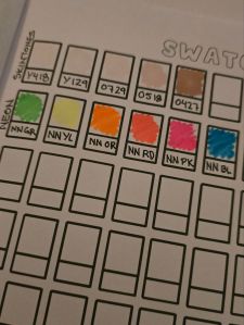 Så ikväll har jag börjat swatcha dom i en av böckerna. Det betyder helt enkelt att jag målarböcker en ruta med färgen och skriver färgnumret under. Så vet jag hur färgen ser ut när den hamnar på pappret. Detta för att färgen som visas på själva pennan inte helt och fullt överensstämmer med hur det blir på pappret. Det kan jag nu enkelt se. Bra va?