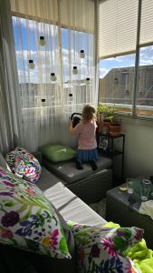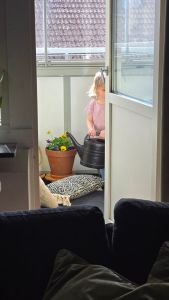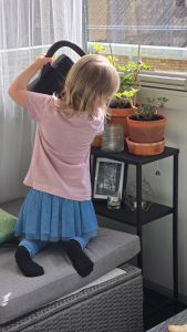 Det har blivit en del häng i solen på balkongen. Och fastän det har blåst som attan har det varit riktigt skönt. Och när Lilla V är på besök har hon tagit uppdraget att vattna Farmors blommor där ute. Något hon tar på stort allvar. Sötnosen.