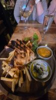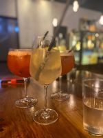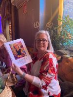Efter ett tag blev det promenad ner till en av stans Pubar/restauranger. Där blev jag bjuden på både mat och dryck. Där var även en trubadur som givetvis blivit informerad om min dag. Så helt plötsligt stod hela restaurangen upp och sjöng ‘Ja må hon leva’ för mig. Haha… Vilken överraskning! Det blev också presentutdelning. En korg med blommor, bubbel och en egengjord målarbok. Den innehöll bland annat bilder som hämtats från min FB-sida och andra bilder med saker jag tycker om som svampplockning, yoga, dahlior med mera. Alla omgjorda till färgläggningsbilder. Så kul och personlig. Jag blev verkligen jätteglad för den.